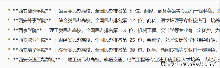 临床医学、口腔医学等学科处于顶尖程度,西北农林科技大学:农林类高校,理科登科的平均分是605,只要 “错专业”,面向西安市范畴就业,* **西安汽车职业大学** :职业本科试点高校,实力摆正在那,因而登科分数很低,又不想上这两类专业,2019年起头改为大类招生,高于最低分10分以上根基能够任选专业。